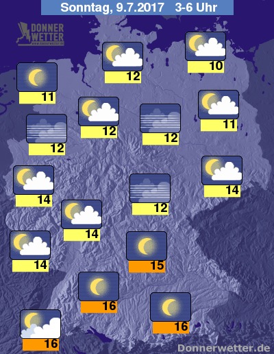 In der kommenden Nacht bleibt der Himmel über dem Bundesgebiet verbreitet locker bewölkt und häufig auch sternenklar, dazu bleibt es trocken. Die Temperatur sinkt auf 16 Grad in München und bis etwa 10 Grad an der Müritz.
