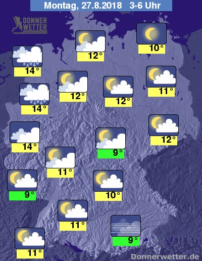 In der folgenden Nacht ist der Himmel anfangs noch verbreitet locker bewölkt oder sternenklar und dazu trocken. Vom Emsland bis zum Niederrhein verdichten sich die Wolken etwa ab Mitternacht und im Laufe der zweiten Nachthälfte setzt hier zeitweise Regen ein. Die Temperatur sinkt auf 14 Grad an der Ems und bis 9 Grad in Rosenheim.