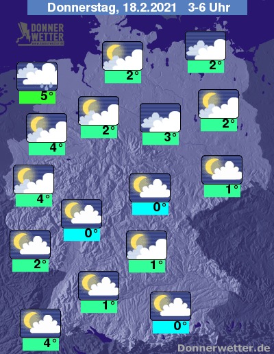 In der folgenden Nacht zeigt sich der Himmel über Deutschland meist aufgelockert oder stark bewölkt. Überwiegend bedeckt bleibt es im Küstenumfeld von Nord- und Ostsee, hier kann etwas Regen fallen. Im übrigen Bundesgebiet bleibt es hingegen trocken bei Tiefstwerten von 5 Grad in Cuxhaven und bis 0 Grad in Jena.