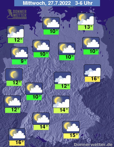 In der Nacht zum Mittwoch zieht zeitweise starke Bewölkung durch, Regen fällt dabei aber nicht. Häufig ist es auch nur locker bis wechselnd bewölkt und teils auch sternenklar. Die Temperatur sinkt auf 16 Grad in Freiburg und etwa 9 Grad in Meppen.