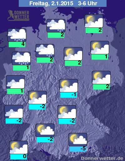 In der Nacht zum Freitag ziehen von Nordwesten her dichte Regenwolken herein, die sich bis zum Morgen etwa bis zu einer Linie von Rheinland-Pfalz nach Berlin-Brandenburg ausbreiten, dabei ist anfangs stellenweise noch mit überfrierender Nässe zu rechnen, da der Boden nicht selten noch gefroren ist. Weiter nach Südosten bleibt es dagegen bei oft aufgelockerter Bewölkung noch trocken. Die Tiefstwerte liegen bei 4 Grad an der nördlichen Ems und bei -5 Grad in München.