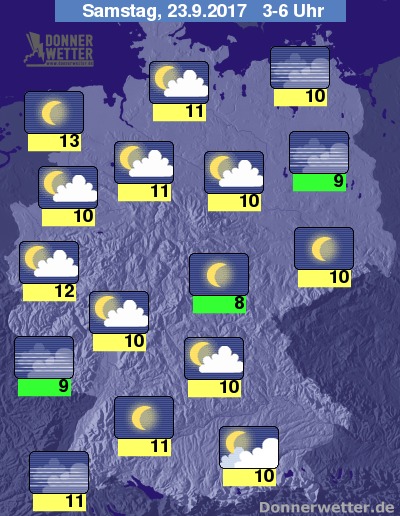 In der Nacht zum Samstag erwarten wir einen oft sternenklaren und sonst nur locker bewölkten Himmel, dazu bleibt es trocken. Die Temperatur sinkt auf Werte zwischen 13 Grad in Emden und bis etwa 8 Grad im Grabfeld.