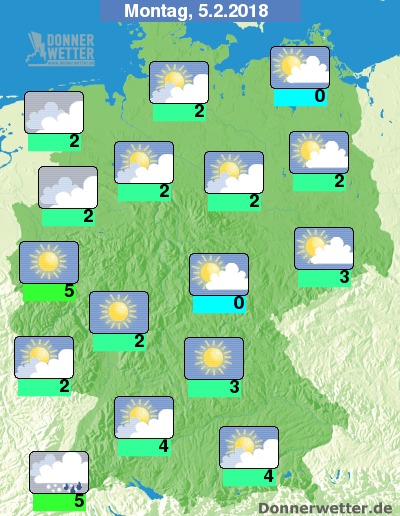 Zum Start in die Woche erwarten wir über weiten Landesteilen reichlich Sonnenschein, dazu ziehen meist nur lockere, teils aufgelockerte Wolken über uns hinweg. Zum Teil wird es auch sonnig. Im Südwesten und im Umfeld der Nordsee ziehen oft dichte Wolken durch, die im äußeren Südwesten auch Regen oder Schneeregen bringen können, sonst bleibt es aber trocken. Die Temperatur steigt auf  0 bis 5 Grad.