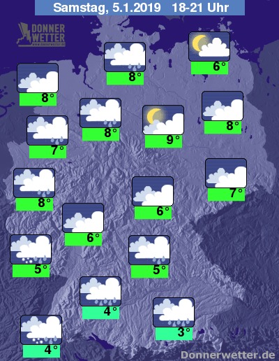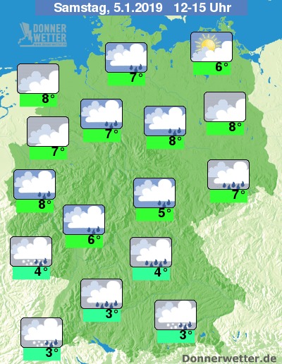Heute Nachmittag zeigt sich das Wetter verbreitet bedeckt und es fällt zeitweise Regen, im Süden auch Schneeregen oder Schnee. Im weiteren Verlauf klingen die Niederschläge im Norden und daraufhin auch im Osten mehr und mehr ab. Auflockerungen sind vor allem im Nordosten möglich. Die Temperatur liegt bei 3 bis 8 Grad.