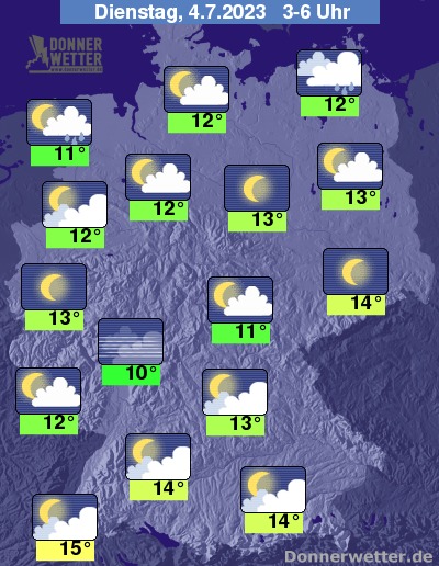 In der Nacht zum Dienstag ziehen im Nordwesten und im Umfeld der Küsten teils dichte Wolken durch, dazu bilden sich hier einzelne Schauer. Oft stark bewölkt ist es auch im Süden, wobei es hier weitgehend trocken bleibt. Im übrigen Land ist der Himmel meist locker bewölkt oder sternenklar, dazu bleibt es trocken. Die Temperatur sinkt auf 15 Grad in Freiburg und etwa 10 Grad in Wiesbaden. An den Küsten weht ein starker und oft auch stürmischer Wind.