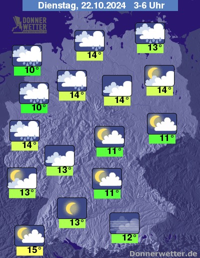 In der Nacht zum Dienstag breitet sich der Regen auch auf den Norden und Westen Deutschlands aus. Vor allem über Sachsen und dem Süden zeigt sich der Himmel meist sternenklar, in den übrigen Landesteilen ist es wechselnd bis stark bewölkt und weitgehend trocken. Die Temperatur sinkt auf 15 Grad in Freiburg und bis 10 Grad im Emden.