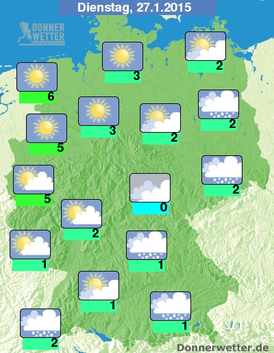 Am Dienstag fällt vor allem im Süden und Osten, gebietsweise aber auch in der Mitte des Landes Schnee, hier und da auch Schneeregen, weiter nordwestlich ist es dagegen verbreitet heiter bis sonnig und trocken. Die Höchstwerte erreichen 0 bis 6 Grad.