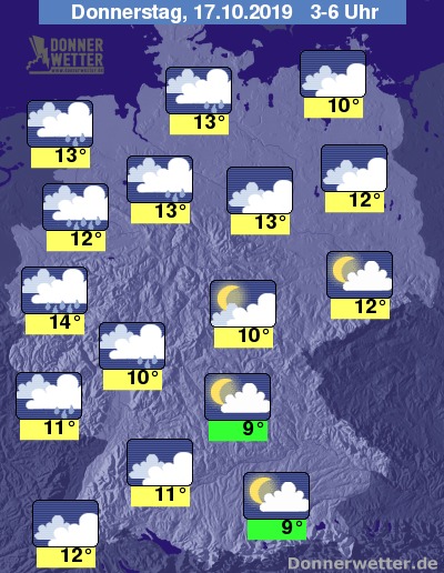 Den Donnerstag begleiten meist dichte Wolken, die im Tagesverlauf Schauer, auch mal Regen mit sich bringen. Auflockerungen gibt es verbreitet in Ostfriesland, um Dresden und um München. Dort bleibt es auch meist trocken. Die Temperaturen erreichen Werte um 15 Grad im Emsland und 18 Grad ums Erzgebirge.