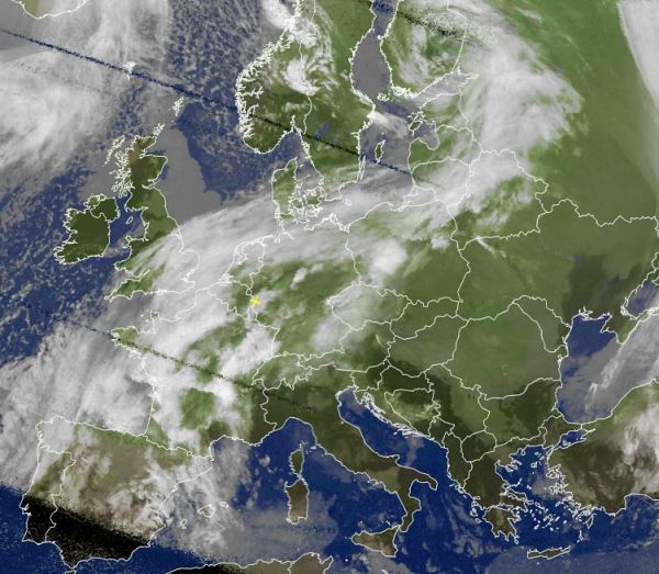 Auf dem Satellitenfoto von heute Morgen ist ein weiterstrecktes Wolkenband zu sehen, dass von der Iberischen Halbinsel bis nach Nordosteuropa reicht. Unter den meist dichten Wolken herrscht verbreitet nasskaltes und teils windiges Herbstwetter.