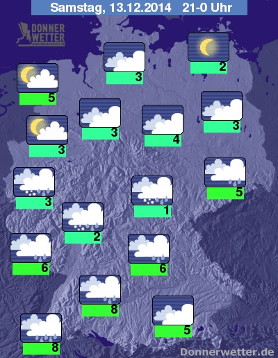 In der Nacht zum Sonntag bleibt es in der Südhälfte der Republik weitestgehend bedeckt und es fällt weiterer Regen, nach Norden hin auch Schneeregen oder Schnee. In der Nordhälfte des Landes lockert die Bewölkung dagegen meist auf und häufig ist der Himmel sogar sternenklar, dabei bleibt es trocken, jedoch bildet sich stellenweise Nebel oder Hochnebel. Die Temperatur sinkt auf 7 Grad in Freiburg und bis -2 Grad am Thüringer Wald.