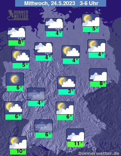 In der folgenden Nacht ziehen im Norden dichte Wolken mit Regen auf. Etwas Regen ist bei dichter Bewölkung auch im Alpenvorland möglich. Im übrigen Land ist es oft locker bewölkt bis sternenklar, hier und da sind auch mehr Wolken unterwegs, dazu bleibt es trocken. Die Temperatur sinkt auf 11 Grad in München und 3 Grad in Jena.