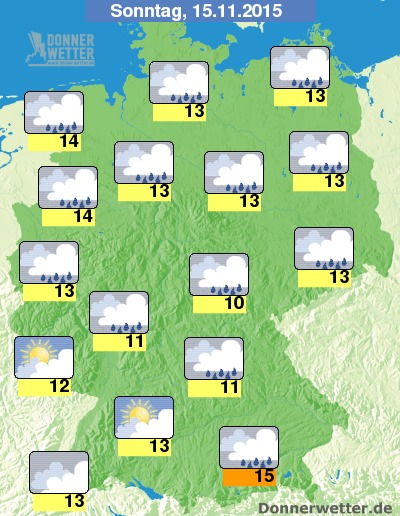 Die Temperaturen liegen leicht über den Samstagswerten und klettern auf 11 Grad C in Frankfurt und um 15 Grad am Alpenrand.