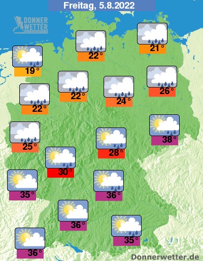 Am Freitag ist es zunächst nur im Nordwesten heiter und trocken, im großen Rest des Landes ziehen meist viele und häufig auch dichte Wolken durch, dabei bilden sich lokale Schauer und vereinzelt auch Gewitter. Im Tagesverlauf heitert es über der Nordwesthälfte auf, dann bleibt es hier trocken. Die Temperatur erreicht 19 Grad an der Nordsee und bis 38 Grad in der Lausitz.