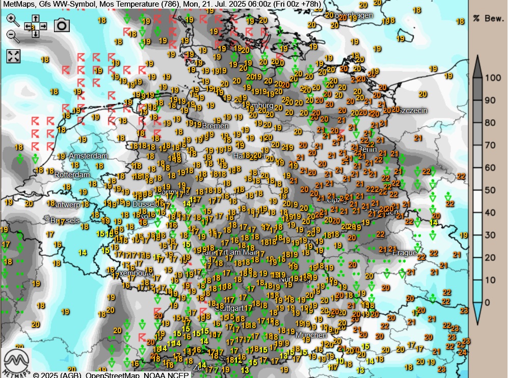 Die Wetter- und Temperaturkarte für Montagmorgen, 06:00 Uhr nach GFS.