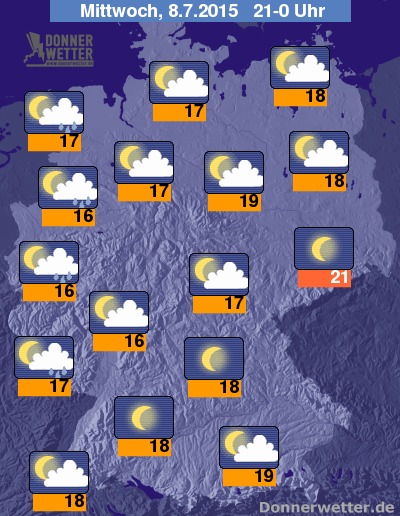 Heute Abend ziehen über die westlichen Landesteile häufig dichte Wolken, die einzelne Schauer mit sich bringen. Überwiegend ist es im Land jedoch locker oder aufgelockert bewölkt und dabei trocken. Im Süden und teils auch im Osten zeigt sich der Himmel auch verbreitet sternenklar. Die Abendtemperatur liegt bei 21 Grad in Dresden und um 16 Grad im Bergischen Land.