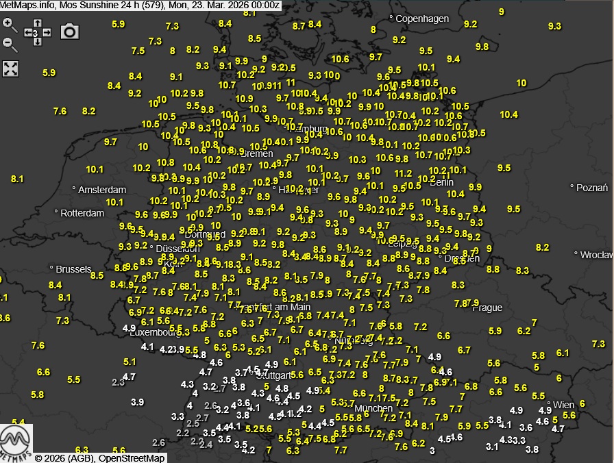 Die Wetterkarte für Sonntagfrüh, die Sechs-Stunden-Höchsttemperaturen bis 18:00 Uhr sowie die Sonnenscheindauer für Sonntag nach ICON: