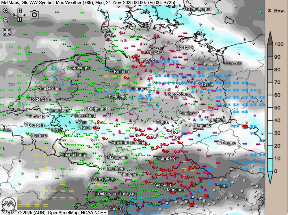 Die Temperatur- und Wetterkarte für Montagfrüh (06:00 Uhr) nach GFS: