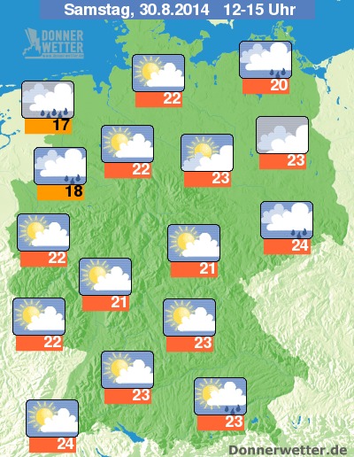 Mit örtlichem Regen geht es für den Norden dann auch in den Samstagabend, hier Temperaturen um 17 bis 24 Grad.