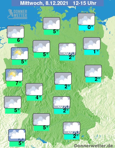 Die Temperaturen erreichen am Nachmittag Höchstwerte um 0 Grad in Nordmecklenburg, 2 Grad am Alpenrand und 7 Grad in der Kölner Bucht