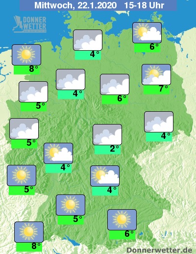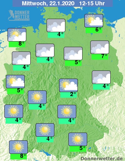 Am frühen Nachmittag halten sich in Norddeutschland noch dichtere Wolken. Örtlich fällt daraus noch etwas Regen. Später lockert es von der See her auf. In der Südhälfte scheint abgesehen regionaler Nebelfelder oder tiefhängender Bewölkung häufig die Sonne.