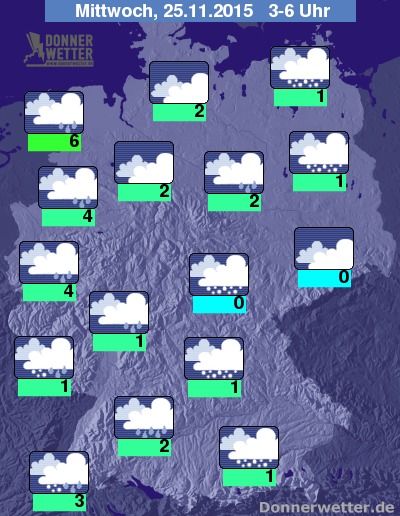 In der Nacht zum Mittwoch bleibt es praktisch im ganzen Land bedeckt, dazu fällt im Norden und Westen zeitweise Regen, im Süden und Osten fallen die Niederschläge zumeist in Form von Schnee, teils aber auch als Schneeregen oder Regen. Es besteht verbreitet Glättegefahr. Die Temperatur sinkt auf 6 Grad in Emden und bis auf Werte um 0 Grad im Grabfeld. Im Ostseeumfeld weht weiterhin frischer bis starker und in Böen stürmischer Wind.