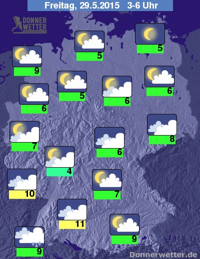 In der kommenden Nacht sind am Schwarzwald unter teils dichten Wolken einzelne Schauer möglich, sonst zieht überwiegend wechselnde, zum Teil auch starke Bewölkung durch und es bleibt trocken. Besonders im Norden zeigt sich auch ein oft sternenklarer Nachthimmel. Die Temperatur sinkt auf 11 Grad in Karlsruhe und auf etwa 4 Grad am Taunus.