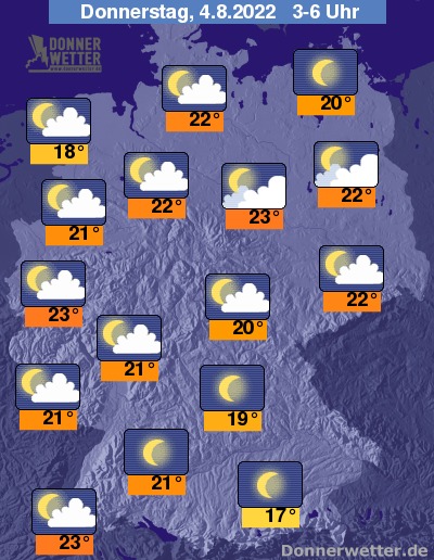 In der bevorstehenden Nacht zeigt sich der Himmel im Süden weitestgehend sternenklar. Im übrigen Land ist es teils auch sternenklar, zumeist jedoch locker bewölkt, dazu bleibt es trocken. Die Temperatur sinkt auf tropische 23 Grad in Freiburg und Magdeburg und bis 18 Grad in Wilhelmshaven.