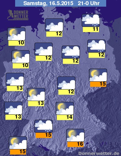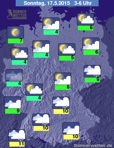In der Nacht zum Sonntag ist es im Osten und Süden meist stark, teils aber auch aufgelockert bewölkt, dazu fällt zeitweise Regen. Der Norden und Westen des Landes zeigt sich zumeist leicht oder aufgelockert und gebietsweise auch sternenklar, hier bleibt es weitgehend trocken. Die Temperatur sinkt auf 11 Grad in Freiburg und bis etwa 4 Grad am Westerwald.