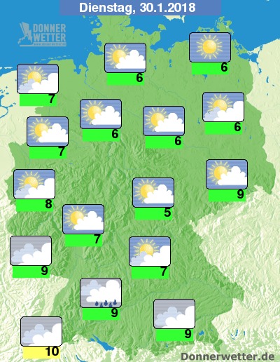 Über dem Süden hält sich zunächst eine dichte graue Wolkendecke, die im Tagesverlauf stellenweise aufbröckelt. Anfangs fällt vereinzelt noch etwas Regen. Sonst gibt es zunächst einige größere Aufheiterungsphasen, bevor sich der Himmel im Tagesverlauf wieder eintrübt. In der Nordhälfte kann eventuell auch mal ein Schauer auftreten. In der Nacht zieht im Westen neuer Regen auf. Die Höchsttemperaturen liegen meist zwischen 5 und 10 Grad, am Oberrhein können örtlich auch 10 bis 12 Grad erreicht werden. Der Wind schwächt sich zunächst weitestgehend ab, bevor er im Laufe des Abends im Nordwesten wieder neu auflebt.
