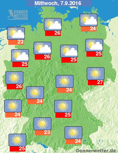 Heute bleibt es von der breiten Landesmitte bis in den Süden hinein weitgehend sonnig und auch trocken. Teils lockere Wolken ziehen jedoch über den Norden hinweg, jedoch bleibt es auch hier trocken. Es werden 23 Grad am Bodensee und bis etwa 27 Grad in der Lausitz erreicht.