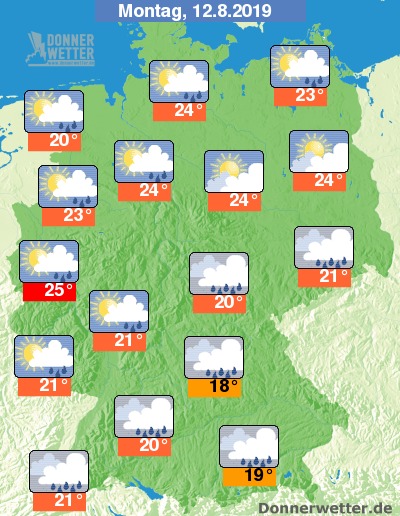 Am Montag bleibt es überwiegend stark bewölkt, im Westen und Norden zeigen sich gebietsweise auch heitere Abschnitte, jedoch bilden sich hier ebenso zeitweise Schauer und lokale Gewitter. Über dem Süden und über Sachsen fällt unter dichten Wolken zeitweise Regen, im Rest der Republik bleibt es hingegen trocken. Die Temperatur steigt auf 18 Grad in Mittelfranken und bis 25 Grad in der Kölner Bucht.