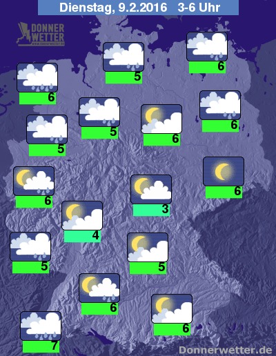 In der Nacht zum Dienstag bleibt es über der breiten Landesmitte meist locker oder aufgelockert bewölkt und trocken. Über dem Norden sowie über dem Süden von Deutschland ziehen dagegen verbreitet dichte Wolken und es fällt zeitweise, teils kräftiger Regen. Die Temperatur sinkt auf 7 Grad im Breisgau und bis 3 Grad im Vogtland. Es weht teils starker, im Norden teils stürmischer Wind. An den Küsten und auf den Bergen der norddeutschen Mittelgebirge herrscht teils Sturm, dabei sind auch orkanartige Böen möglich.