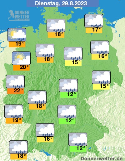 In der Nacht zum Dienstag bleibt es vom Süden bis nach Sachsen und Thüringen bedeckt und es fällt zeitweise Regen, wobei sich die Niederschläge bis zum Morgen auch bis nach Sachsen-Anhalt ausbreiten. In den übrigen Landesteilen ist es oft stark, teils locker bis aufgelockert bewölkt und dazu weitgehend trocken. Die Temperatur sinkt auf 14 Grad im Rheinland und bis 10 Grad im Saargau.
