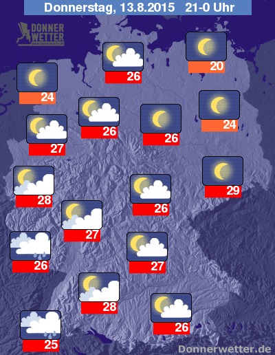 Der Donnerstag verabschiedet sich meist nur in der Osthälfte mit sternenklarem Himmel, im restlichen Bundesgebiet dominiert wechselnde Bewölkung. Örtliche Schauer beschränken sich weiterhin auf die Südwesthälfte des Landes. Die Temperaturen liegen bei Werten um 29 Grad C in Sachsen und um 24 Grad in Emden.