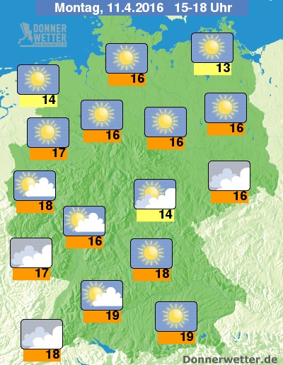 Heute Nachmittag ist es im Norden verbreitet sonnig und trocken, im Südwesten ziehen jedoch zum Teil schon dichte Wolken auf, dabei besteht ein leichtes Schauer- und Gewitterrisiko, im übrigen Bundesgebiet ziehen meist nur einige Wolken durch, dabei bleibt es trocken. Die Temperatur steigt auf 13 Grad in Rostock und bis 19 Grad in München.