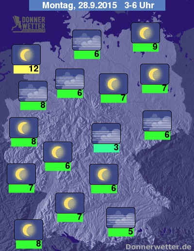 In der Nacht zum Montag bleibt der Himmel verbreitet wolkenfrei, dabei bleibt es natürlich trocken. Stellenweise kann sich jedoch Nebel oder Hochnebel ausbilden. Die Temperatur sinkt auf 12 Grad an der Nordsee und bis kalte 3 Grad im Vogtland. Örtlich besteht dabei die Gefahr durch Rauhreifbildung!