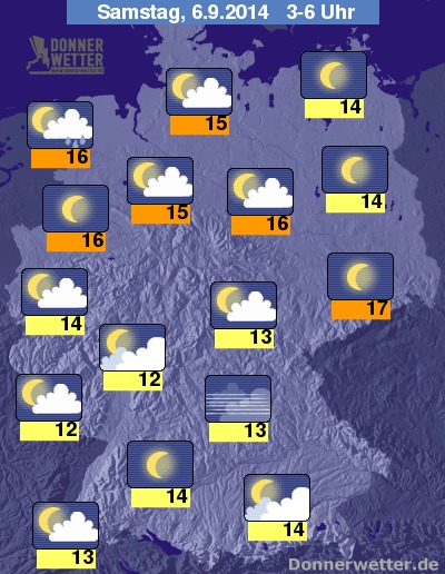 In der Nacht zum Samstag zeigen sich häufig die Sterne, es ziehen aber auch immer wieder mehr oder weniger große Wolken durch, dabei sind im Westen und Süden vereinzelt auch kurze Schauer möglich, sonst bleibt es aber trocken. Häufig sternenklar wird es besonders im Osten und Nordosten der Bundesrepublik. Die Temperatur sinkt auf 17 Grad in Chemnitz und etwa 12 Grad am Pfälzer Wald.