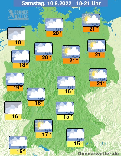 Heute Abend können sich weiterhin vielerorts Schauer und vereinzelt auch Gewitter bilden. Besonders im Norden und Osten heitert der Himmel jedoch auch zwischenzeitlich auf. Die Temperatur liegt bei 15 Grad in Nürnberg und etwa 21 Grad in Berlin