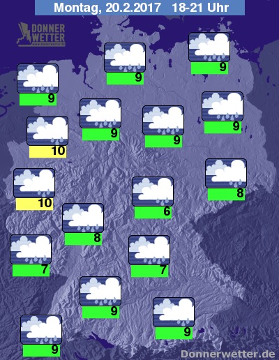 Heute Abend ist es im gesamten Bundesgebiet bedeckt und zudem auch verbreitet regnerisch. Gebietsweise fällt auch langanhaltender Regen. Die Temperaturen bewegen sich zwischen 6 Grad im Vogtland und etwa 10 Grad im Münsterland.