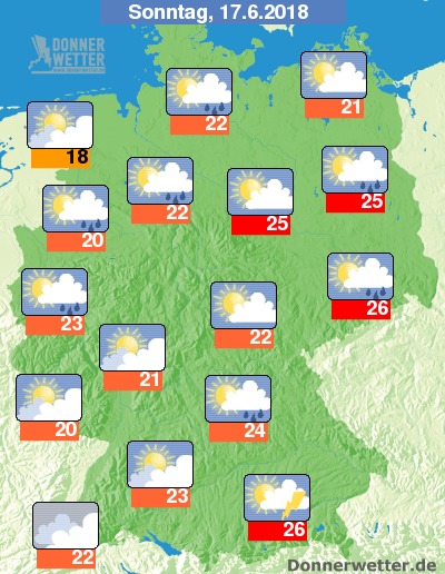 Heute bilden sich im Süden und Osten Deutschlands zeitweise Schauer und einzelne Gewitter, sonst ist es teils aufgelockert, teils stark bewölkt bei jedoch nur seltenen Schauern. Die Temperatur steigt auf 18 Grad im nördlichen Emsland und bis 26 Grad im Raum München.