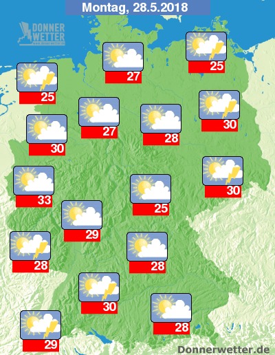 Heute ist es zunächst verbreitet heiter bis sonnig und trocken, im Südwesten sind jedoch bereits am Vormittag Schauer und örtliche Gewitter möglich. Im weiteren Tagesverlauf steigt auch das Gewitterrisiko über dem Süden und Westen stark an. Im Norden und Osten bleiben Schauer und Gewitter hingegen deutlich seltener, hier scheint überwiegend die Sonne bei meist nur leichter Bewölkung. Die Temperatur steigt auf 25 Grad in Stralsund und bis 33 Grad in Köln.