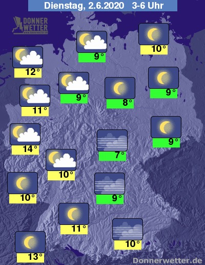 In der kommenden Nacht bleibt es über der Südosthälfte Deutschlands sternenklar, dagegen sind vom Westen, über den Nordwesten bis in den Norden auch einige Wolken möglich, dazu bleibt es trocken. Die Temperatur sinkt auf 14 Grad in der Kölner Bucht und bis 7 Grad im Vogtland.