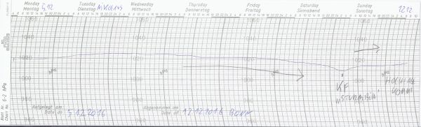 Nach einem über weite Teile grauen Wochenstart macht sich im Wochenverlauf wieder zunehmend Hochdruckeinfluss bemerkbar. Unser Schrieb zeigt den Luftdruckverlauf im Zeitraum 05.12. bis 12.12.