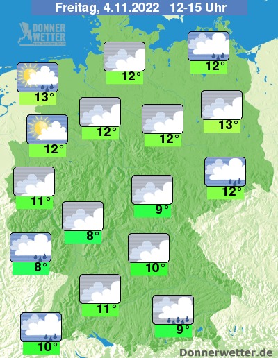 Heute Nachmittag hält sich über der Bundesrepublik verbreitet dichte Bewölkung und nur ganz selten zeigen sich mal Auflockerungen, am ehesten noch vom Niederrhein bis zur Nordsee. Vereinzelt bilden sich Schauer. Im Süden und Osten fällt gebietsweise Regen . Die Temperatur liegt bei 8 Grad am Westerwald und bis 13 Grad in Berlin.