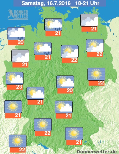 Heute Abend ist es im Norden und Westen noch oft stark, hier und da aber auch aufgelockert bewölkt, es fällt gebietsweise Regen. Besonders im Süden scheint verbreitet die Sonne bei einem oft wolkenlosen Himmel, im übrigen Bundesgebiet ist es meist heiter bis sonnig und ebenso trocken. Die Temperatur liegt bei 20 Grad in Unterfranken und bis 23 Grad in Köln.