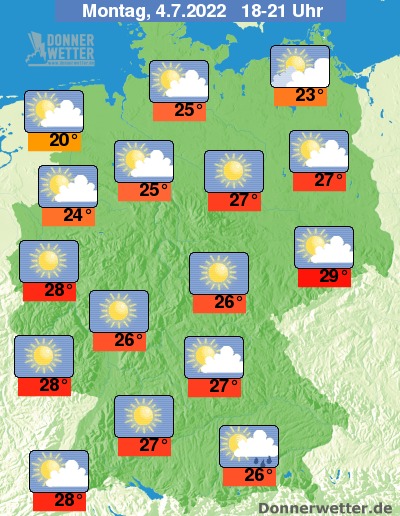 Heute Abend ist es weiterhin heiter oder sonnig und dabei weitgehend trocken. Im Alpenvorland ziehen jedoch gebietsweise dichte Wolken auf und es können sich sowohl Schauer als auch Gewitter bilden. Die Temperatur liegt bei 20 Grad an der Nordsee und bis zu 29 Grad in der Lausitz.