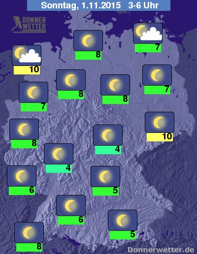 Am heutigen Helloweenabend steht allen Freunden des schaurigen Gruselns und deren Kostümen wettertechnisch nichts im Wege, denn allenfalls über dem Norden und Nordwesten des Landes hält sich öfters eine lockere Bewölkung, im übrigen Bundesgebiet zeigt sich der Himmel hingegen verbreitet sternenklar, dabei bleibt es landesweit trocken. Die Abendtemperatur liegt bei 13 Grad in Dresden und um 8 Grad am Odenwald.