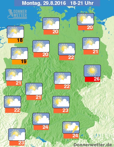 Heute Abend bleibt es im Alpenvorland noch meist stark bewölkt, dabei sind hier weiterhin einzelne Schauer und Gewitter möglich. Meist heiter bis sonnig und dazu trocken zeigt sich ein breiter Streifen vom Saarland quer rüber bis nach Sachsen. Nördlich davon ist es teilweise heiter, meist zieht jedoch wechselnde Bewölkung durch, dabei bleibt es trocken. Die Abendwerte liegen bei etwa 18 Grad in Emden und um 26 Grad in Görlitz.