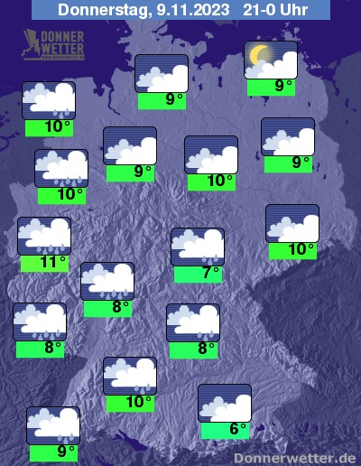 Die Temperaturen gehen bis Mitternacht auf Werte um 11 Grad im Rheinland und 6 Grad am Alpenrand zurück.