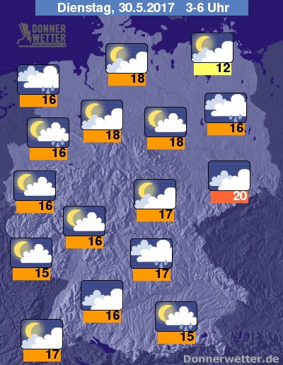 In der Nacht zum Dienstag bilden sich zunächst weiterhin gebietsweise Schauer und örtlich auch noch kräftige Gewitter. In der zweiten Nachthälfte sinkt das Unwetterrisiko insgesamt und vor allem über der Westhälfte lockert der Himmel häufig auf. Besonders über der Osthälfte bleibt es aber bis zum Morgen weiterhin stark bewölkt und es sind gebietsweise Schauer und einzelne Gewitter möglich. Die Temperatur sinkt auf tropische 20 Grad in Dresden und etwa 12 Grad in Rostock.